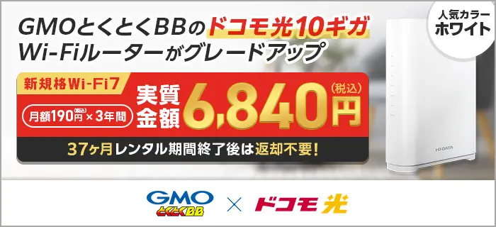 ドコモ光1ギガをGMOとくとくBBからお申込みした場合、1ギガ対応のルーターが無料でレンタルできます!家電量販店でルーターを購入する必要がないので、有難いですね。②:10ギガWi-Fiルーターが月額190円で使える!