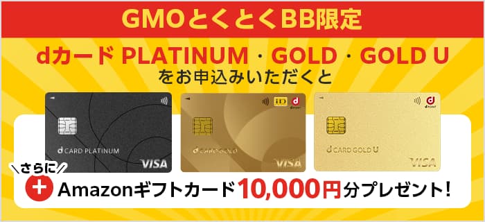 まだdカードをお持ちでない場合、ドコモ光の利用料金によってdポイントが貯まるdカードのお申込みもおすすめ!とくとくBBからの入会だと10,000円分のAmazonギフトカードが貰えるため、いずれ入会するなら今がいいです。