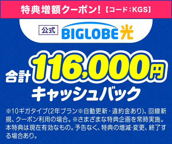 auやUQモバイルのスマホを使っている方や、今よりもっと安いネット回線をお探しの方は、ビッグローブ光がおすすめ。クーポンコード(KGS)を使うとキャッシュバックが増額されるので、ぜひ活用してください。