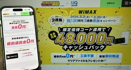当サイトからのお申込限定で、キャッシュバックが通常より18,000円増額されて48,000円に!