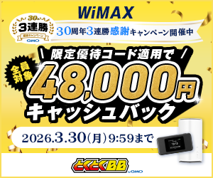 GMOとくとくBB WiMAXは、業界最高額のキャッシュバックと端末代実質無料キャンペーンを同時に受けられるため、WiMAXを最安の3,432円で使えるプロバイダです。これ以上安いWiMAXはありません。